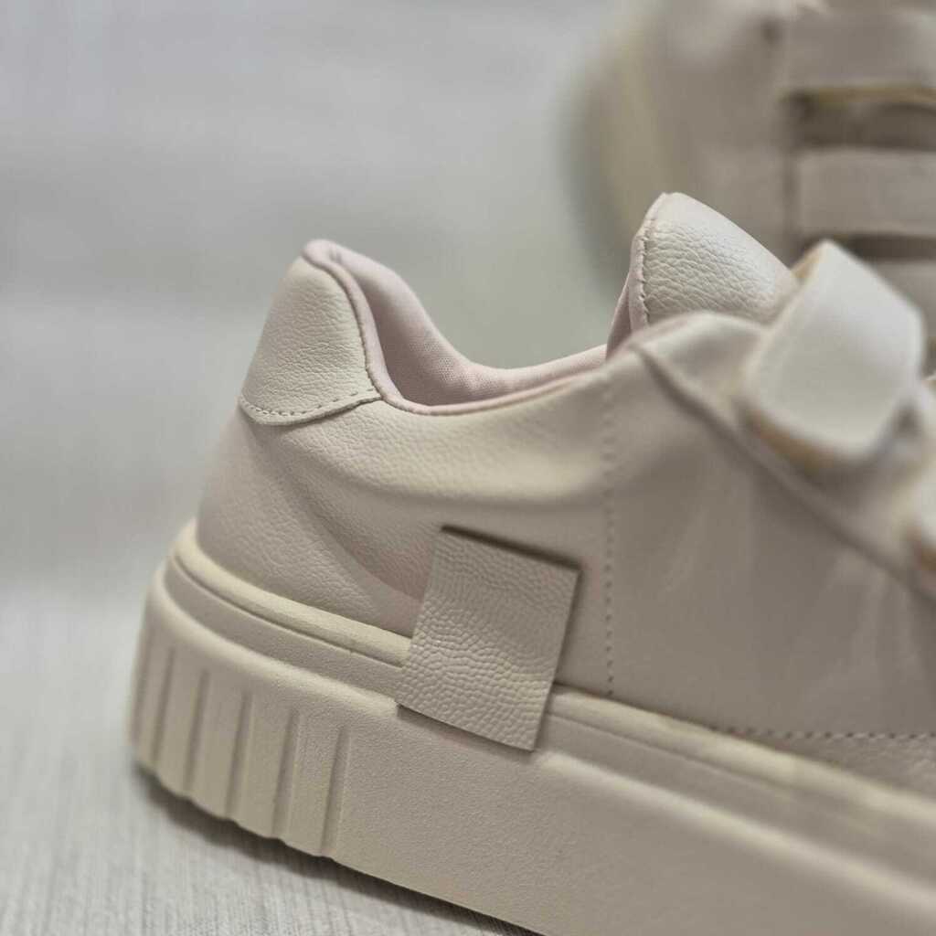 Tênis confeccionado em material sintético. Cabedal liso com tiras autocolantes no peito do pé.